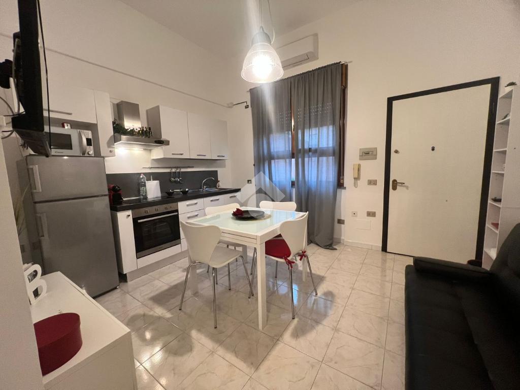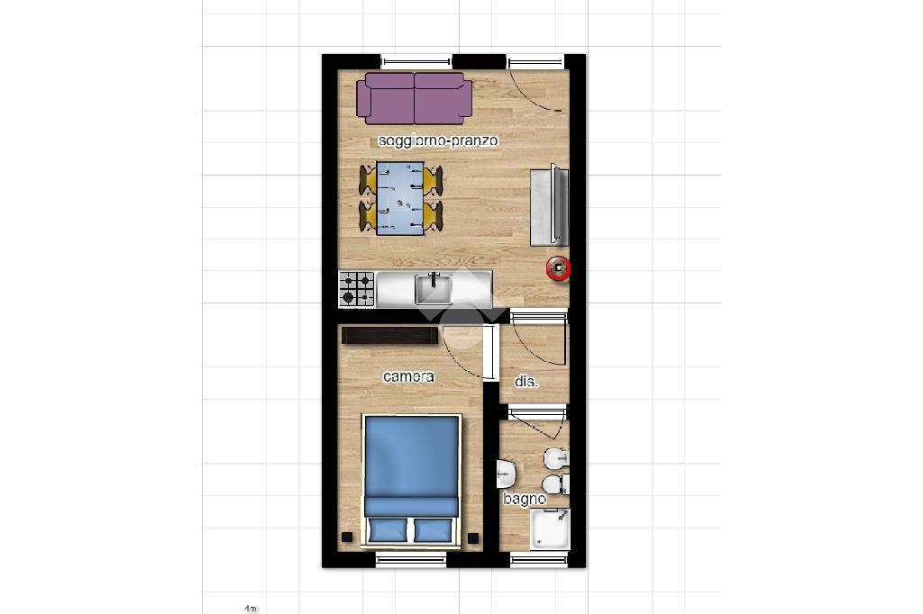 Composto da due locali, l'appartamento include una camera da letto matrimoniale, un comodo soggiorno con angolo cottura, e un bagno.
